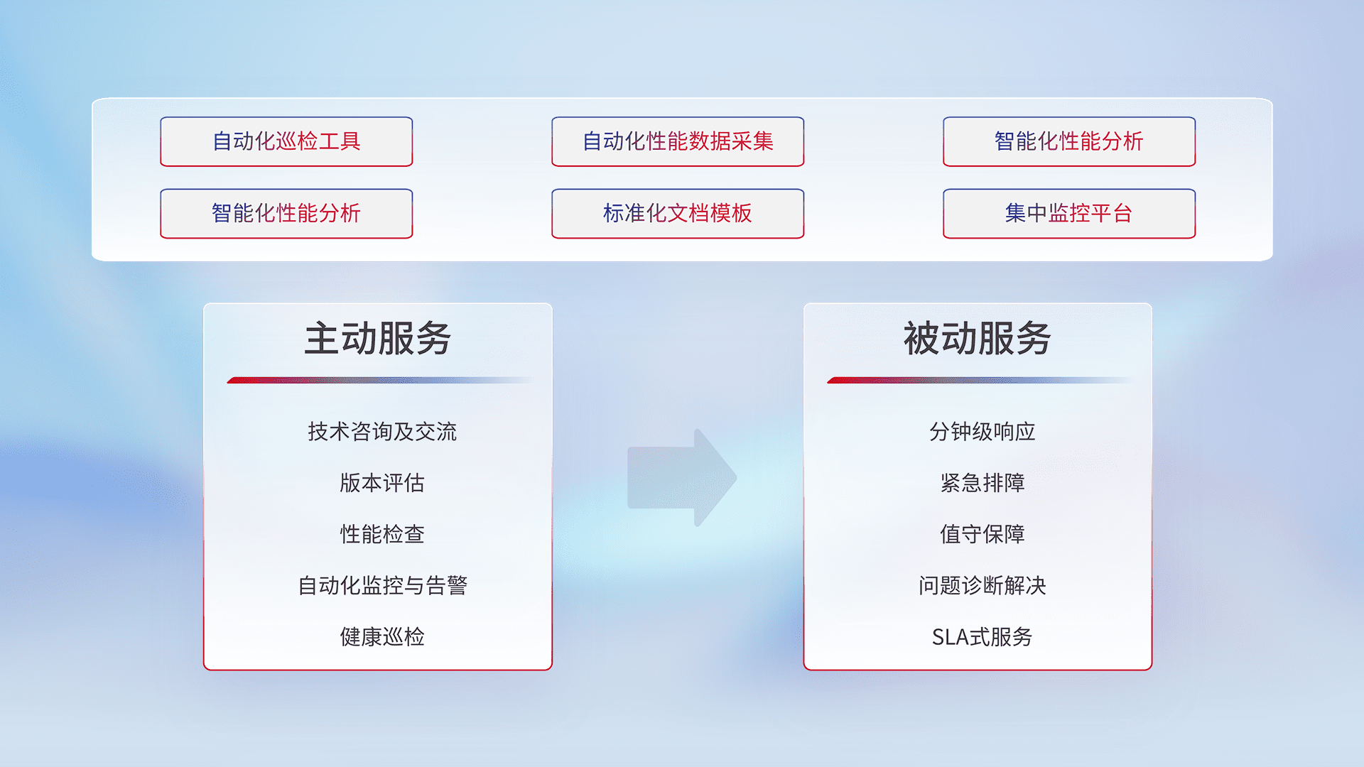 智能化工具和标准化文档,,,保障服务质量,,,,提供主动服务(包含技术咨询、、版本评估、、、、性能检查、、、自动化监控与告警、、、、健康巡检)和被动服务包含(分钟级响应、、、紧急排障、、、、值守保障、、问题诊断解决、、、、SLA服务)。。